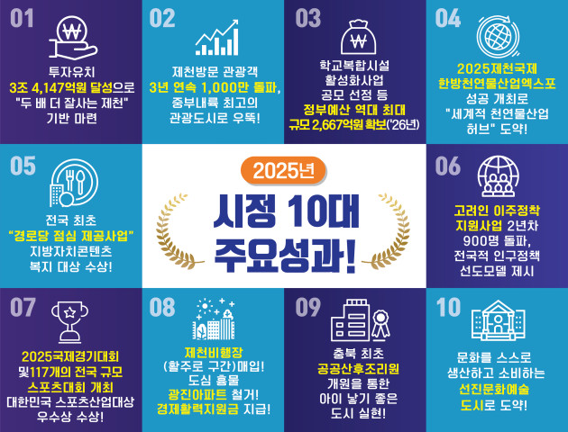 제천시가 2025년 한 해를 마무리하며 ‘역동적이고 새로운 경제도시 제천’ 실현을 목표로 13만 시민과 1,200여 공직자의 열정과 노력을 바탕으로 거둔 올해의 10대 성과를 선정해 발표했다.