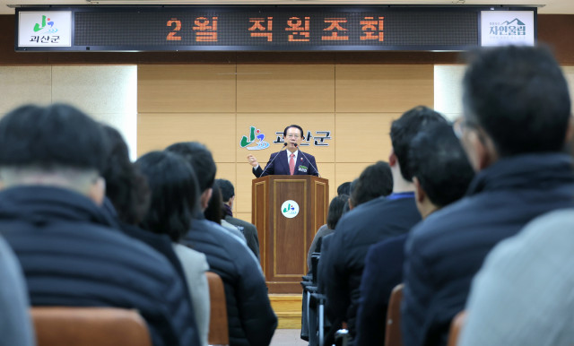 송인헌 괴산군수가 2일 군청 대회의실에서 열린 직원조회에서 주민과 밀접한 행정의 홍보 강화와 친절·책임행정 실천을 강조했다.