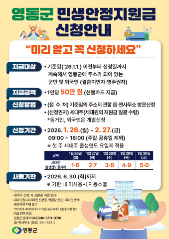 영동군, 민생안정지원금 50만 원 지급한다. 26일부터 신청지급