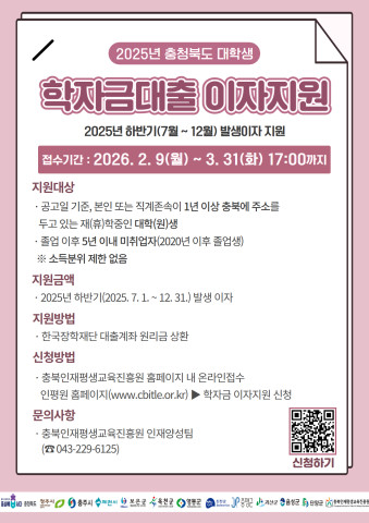 신청은 충북인재평생교육진흥원 누리집에서 온라인으로 진행되며, 제출 서류에 대한 심사를 거쳐 5월 중 이자 지원이 이뤄질 예정이다.