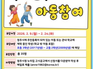 모집 대상은 청주시에 주민등록을 두고 있거나 관내 학교에 재학 중인 2017년생부터 2009년생까지(초등학교 3학년부터 고등학교 2학년에 해당하는 연령) 아동이며, 학교 밖 청소년도 참여할 수 있다.